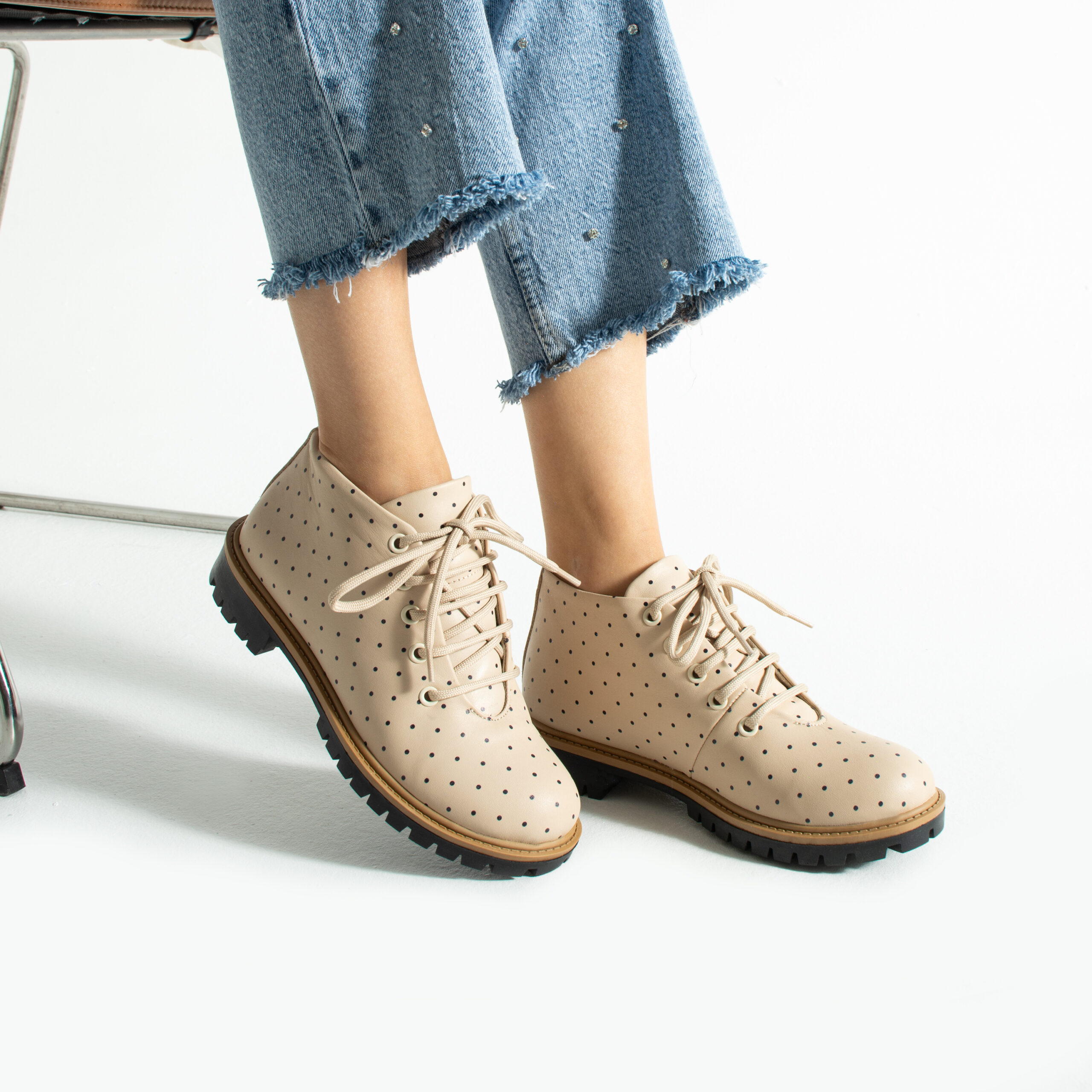 Confeccionados en piel natural de primera calidad y en un suave tono beige con un elegante estampado de lunares, estos botines combinan estilo, calidez y una comodidad excepcional.