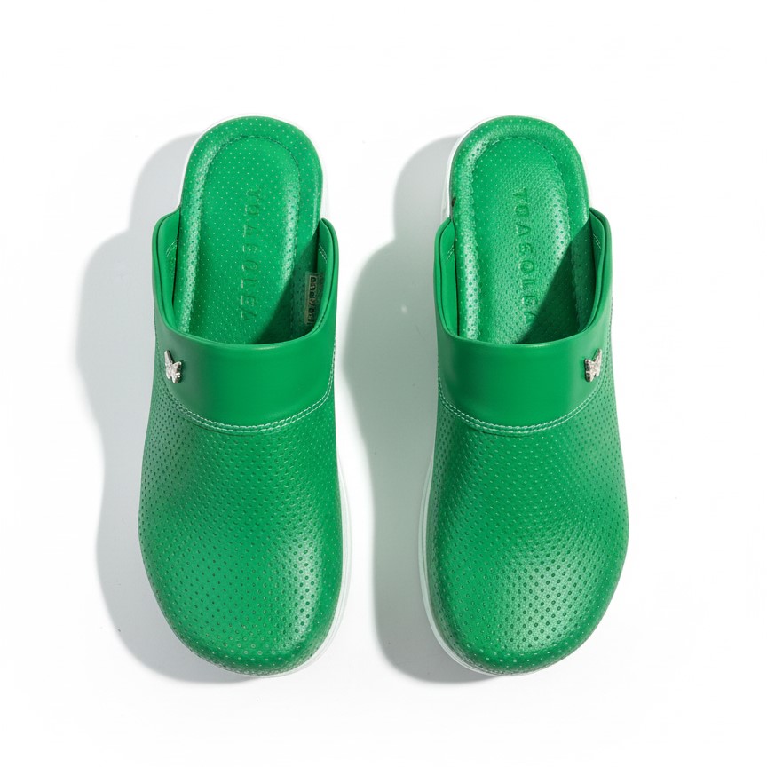 Las zuecos anatómicos Comfort para mujer en verde intenso combinan diseño moderno con alta funcionalidad: una elección ideal para profesionales que pasan muchas horas de pie. La parte superior está fabricada en eco‑piel de alta calidad con perforación decorativa.